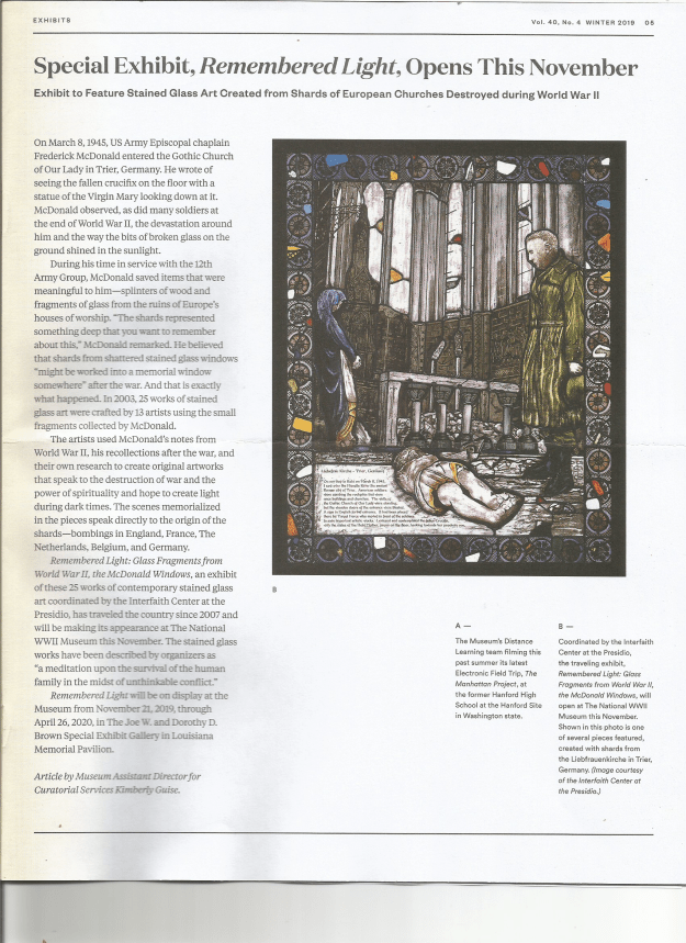 Of course the big notice relates to the 75th Anniversary of the Battle of the Bulge, but inside is this article that give a great synopsis of the planned Remembered Light. This is the featured stained glass art created from shards of European churches. Looks to be a very moving exhibit and I am glad to have an opportunity to see it in 2020 in San Francisco!