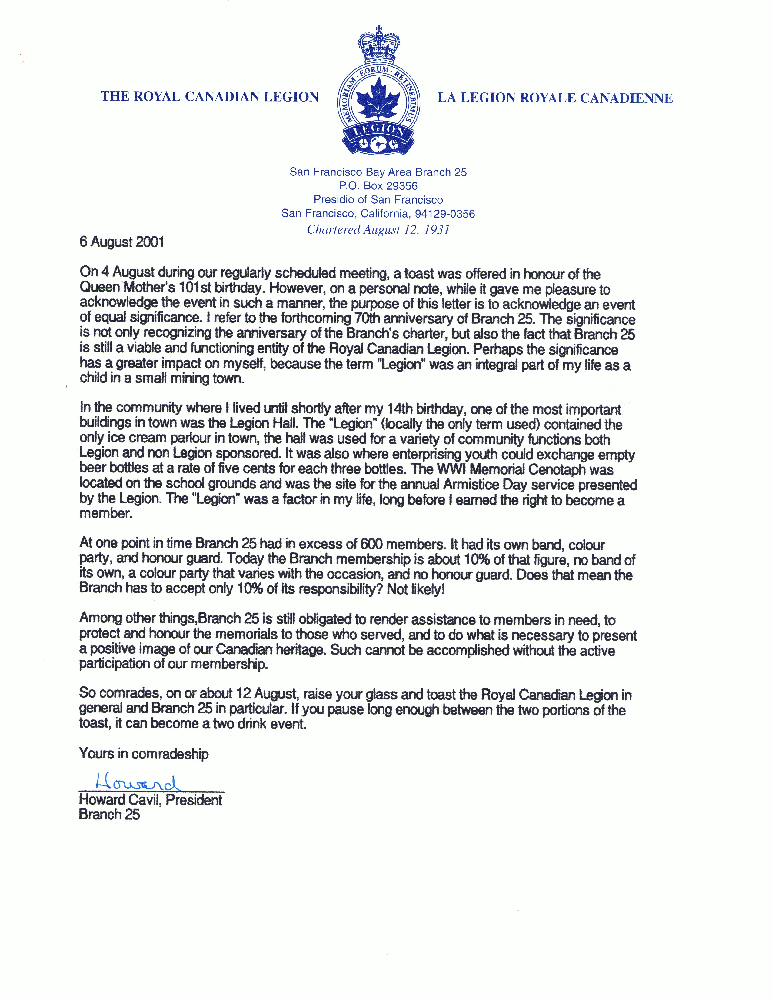 In the coming days you’ll have an opportunity to read more about over activities in the Bay Area from our annual Poppy Campaign to our services of remembrance to sponsoring a cadet corps to the maintenance of several cemeteries where Canadian and Commonwealth servicemen and women are laid to rest.